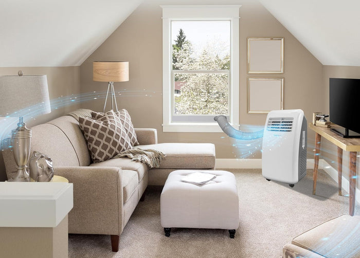 The compact floor AC indoor cooler conditioning unit features a simple electric plug in operation and has 3 modes - cooling, dehumidifier and fan. Also features automatic swing mode w/ moving wind vent for maximum air circulation.