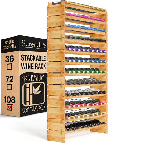 12 Tier Wine Shelf - Strong Frame Solid Bamboo For 108 Bottle Wine Capacity (Color)